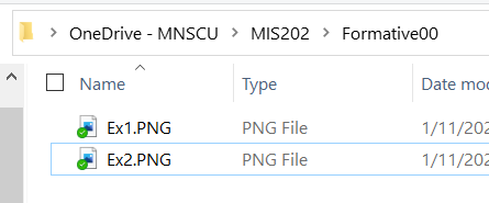 Windows File Explorer will organize the files and folders needed to complete coursework. Using OneDrive for Business provides an automated backup of these files-for this class and others. In this class File Explorer or Finder is used- To create folder structures that organize your work, such as screenshots to prove you have completed Exercises. These items are stored on your laptop, and One Drive for Business automates the backup process to the cloud. These instructions reduce the chances of losing any class work.