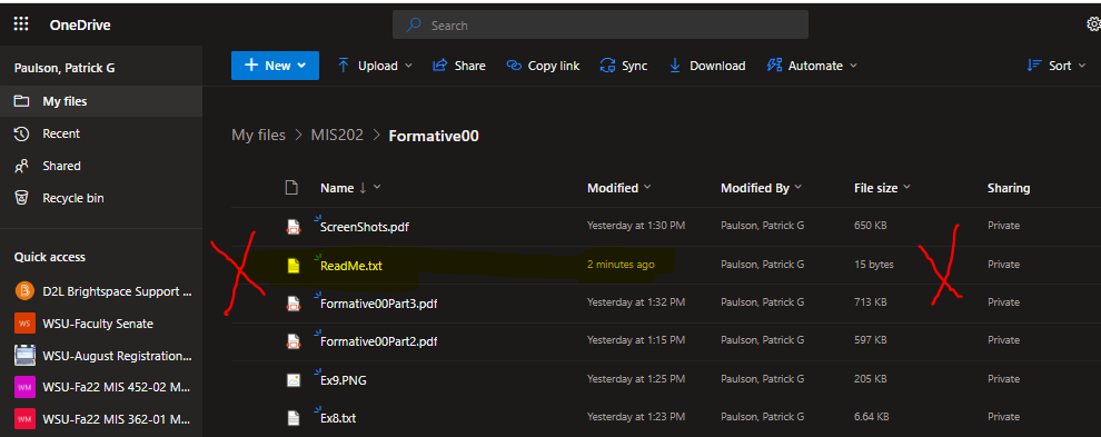 After creating the ReadMe.txt file, open the browser to the OneDrive Lab01 folder for this class, and in a few minutes the file should appear. If not it is time to begin trouble shooting. ' . Use the Snipping Tool to make a screenshot of this file in OneDrive in your browser. It will first look like this: Then it will rename the file like this: 2. Save the screenshot as "Ex1B" in your OneNote file in the ' ' folder.