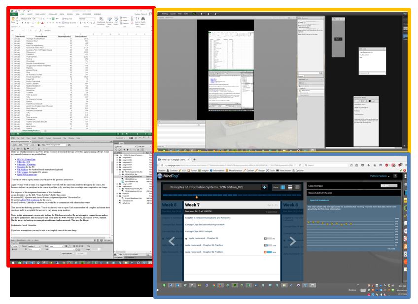 When using external monitors you can have a 'public' and 'private' display. The primary laptop display can be private, viewable only by the user. The external monitors can be public, viewed by others. This allows the user to view class notes, email, Desire2Learn information privately on their laptop. The user can publicly share a website or spreadsheet.
